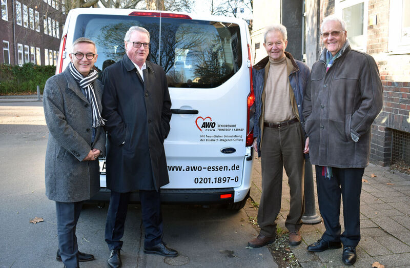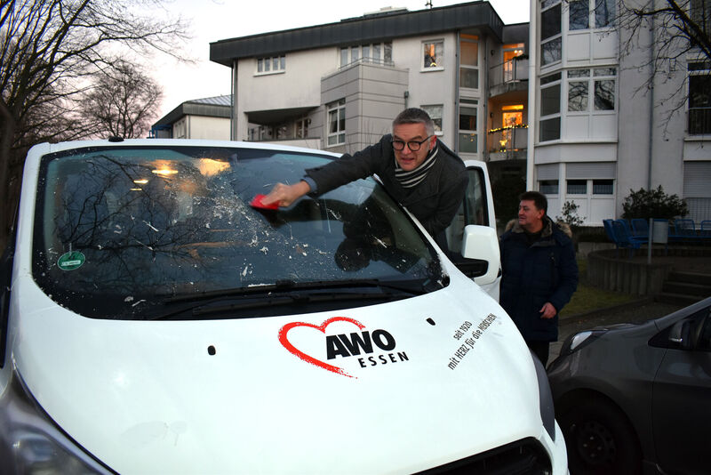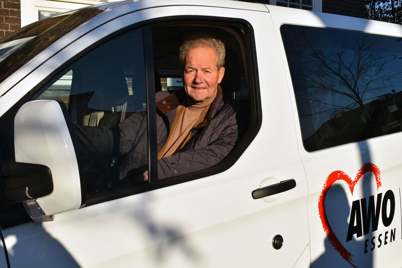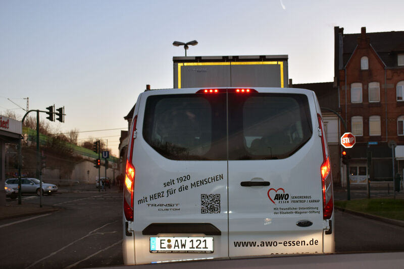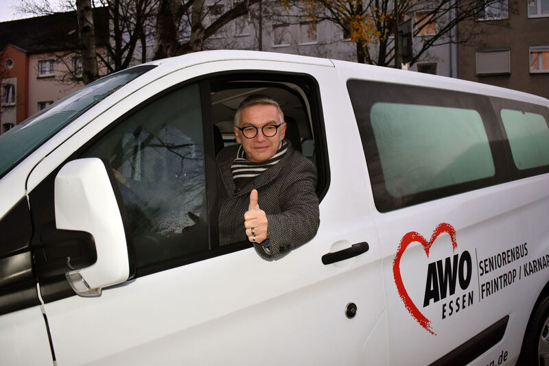 Dank der großzügigen Unterstützung der Essener Elisabeth-Wagener-Stiftung konnte die AWO ein behindertengerechtes Fahrzeug anschaffen, das ausschließlich für Seniorenfahrten in Karnap und Frintrop eingesetzt wird. Am Steuer des neuen Busses sitzt Olaf Hellmecke, der heute zwei Beifahrer hat. Zum einen Gerd Klose aus dem achtköpfigen Seniorenbus-Team und AWO Geschäftsführer Oliver Kern, der heute die ganze Schicht als helfende Hand begleitet.