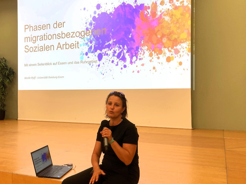 Prof. Dr. Nicolle Pfaff von der Universität Duisburg-Essen beleuchtete in ihrem Vortrag angesichts des Jubiläums die Geschichte der Migrations- und Integrationsarbeit in Essen und die Entwicklung der sozialen Arbeit seit den 1950er Jahren. Sie betonte, dass Migration eine konstante Größe in der Geschichte des Ruhrgebiets darstelle und dass migrationsbezogene Aspekte immer ein integraler Bestandteil der sozialen Arbeit im Ruhrgebiet gewesen seien und auch blieben.