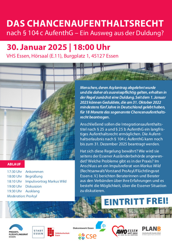 Ist das Chancenaufenthaltsrecht für Menschen, deren Asylantrag abgelehnt wurde, ein Ausweg aus der Duldung? Dies fragen die AWO Essen, der Verein ProAsyl, der Verein PlanB Ruhr, das Diakoniewerk Essen, die Caritas-SkF-Essen, die Stadt sowie die Volkhochschule Essen in ihrer gemeinsamen Veranstaltung am Donnerstag, 30.Januar, ab 18 Uhr, im Hörsaal E.11 der VHS, Burgplatz 1. Im Anschluss an ein Impulsreferat von Markus Wild (Rechtsanwalt/Vorstand ProAsyl/Flüchtlingsrat Essen e. V.) berichten Berater*innen aus den Verbänden über ihre Erfahrungen und es besteht die Möglichkeit, über die Essener Situation zu diskutieren.