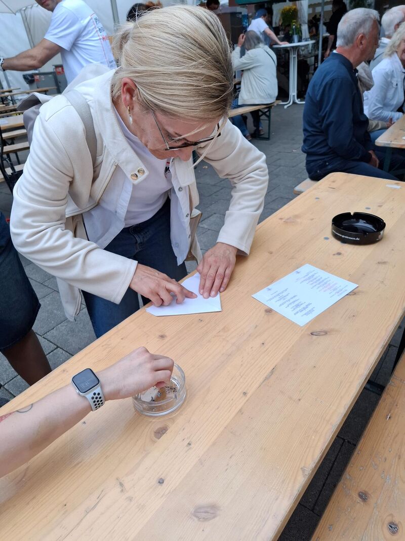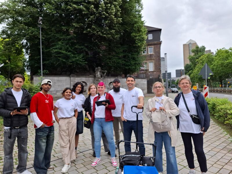 Gemeinsam ging es auf eine Stadtrallye durch Essen, die es in sich hatte. Nach dem gemeinsamen Frühstück in der Bar-Celona in der Innenstadt ging’s los. Die Aufgaben waren vielfältig. Die Pose der Alfried-Krupp-Statue vor der Marktkirche nachstellen, die Fenster der VHS zählen, ein Video auf dem roten Teppich vor der Lichtburg drehen, Papierboote basteln auf dem Friedensplatz (ehemals Kardinal-Hengsbach-Platz) und sie durch die Kanäle am dortigen Wasserspielplatz segeln lassen, eine eingemauerte Maus im Kreuzgang am Dom finden: Das waren nur einige der Aufgaben, die sie zu bewältigen hatten. Wenn nicht reines Faktenwissen gefragt war, wurden Fotos und Videos per Tablet ins Spiel hochgeladen. Den Abschluss bildete ein Besuch beim Sommerfest des Kurt-Schumacher-Zentrums der AWO in Überruhr, wo sie vom Ehrenvorsitzenden der Essener AWO, Klaus Johannknecht, sowie den AWO Vorständen Claudia Osterholt und Oliver Kern begrüßt wurden.