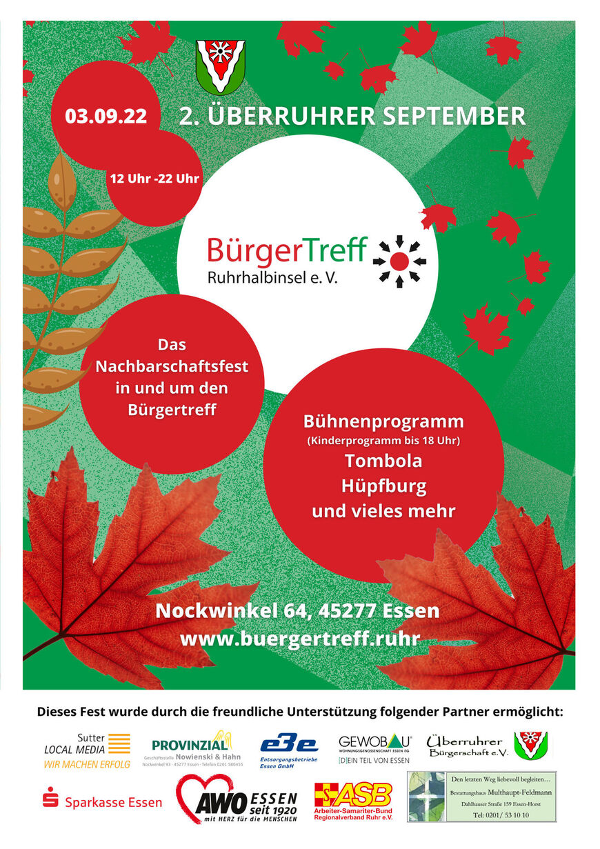 Es ist wieder soweit. Der „BürgerTreff Ruhrhalbinsel“ lädt gemeinsam mit seinen Partner*innen zum zweiten Mal zum „Überruhrer September“, Samstag, 3. September, ab 12 Uhr. im und am BürgerTreff, Nockwinkel 64. Da macht auch die Essener AWO mit: Sie wird für viel Spaß bei den kleinen Gästen mit Hüpfburg und Rollenrutsche sorgen, außerdem hat sie auch bei der großen Tombola unterstützt. Außerdem erwartet die Gäste u.a. am 15 Uhr ein Auftritt der Mädchen und Jungen aus dem „Showtanzworkshop“ aus dem Ferienprogramm, gegen 19 Uhr Uhr parodiert die Band „Magic Touch“ große Rock- und Popstars in einer humorvollen und vor allem mitreißenden Show. Für das leibliche Wohl wird gesorgt!