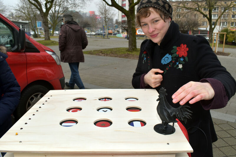Auf Interesse stieß auch ein multikulturelles Spiel, bei dem man am Hahnenschrei erkennen muss, aus welchem Land der Vogel stammt. Entwickelt wurde es von Carina Hommel, die im Hauptberuf für die AWO die Parkour-Anlage auf Zollverein betreut.