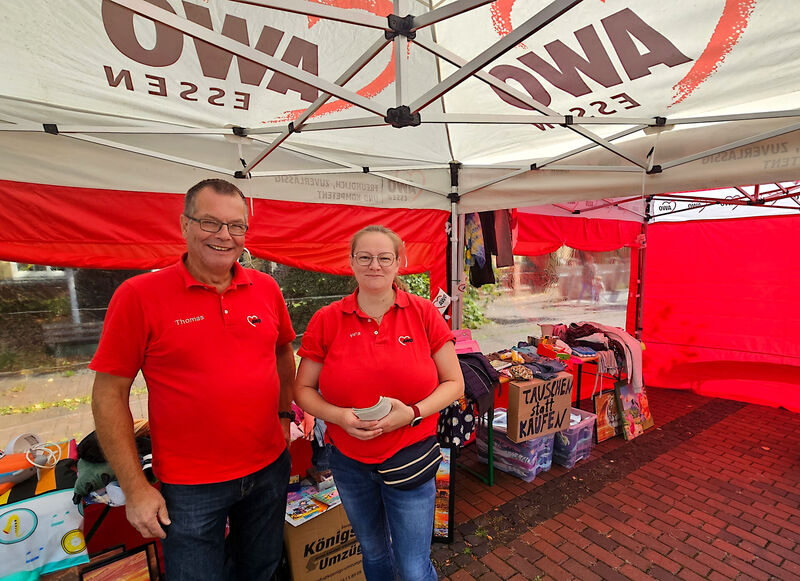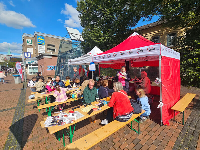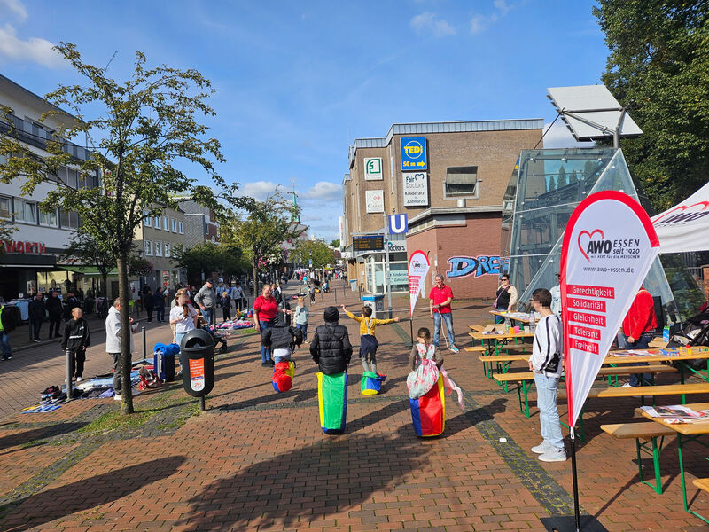 Über mangelnde Arbeit konnten sich die Mitglieder des Ortsvereins Essen Nord (Altenessen und Karnap) am vergangenen Wochenende wahrlich nicht beschweren. Mit einem großen Stand mit vielen Sitzgelegenheiten, einer Menge Infos und noch mehr Spaß für Kinder präsentierte sich die Gruppe auf dem Altenessener Stadtteilfest. „Wir haben heute viele Spiele wie Schach oder Mensch-ärgere-Dich-nicht mitgebracht“, erläuterte die Ortsvereinsvorsitzende Vera Hill das Angebot, das kleine und auch große Besucher gerne nutzten und das lange Zeit über für eine Menge Verkehr am Stand sorgte. Außerdem organisierte die zweifache Mutter Wettbewerbe in Sackhüpfen, Eierlaufen und Dreibeinrennen – dabei starten die Kinder in Zweierteams, deren jeweils rechter und linker Fuß werden zusammengebunden – auf dem Pflaster vor der Karlschule. Klar, dass da auch viele kleine Preise zu gewinnen waren. Außerdem hatte das Team aus Altenessen auch Auswahl an Textilien und Gegenständen dabei, die aus der regelmäßigen Tauschbörse des Ortsvereins hervorgegangen waren und die auf viel Interesse stießen. Vorstandsmitglied Thomas Osterholt erläuterte Fragen der Besucher zur Rentenversicherung.