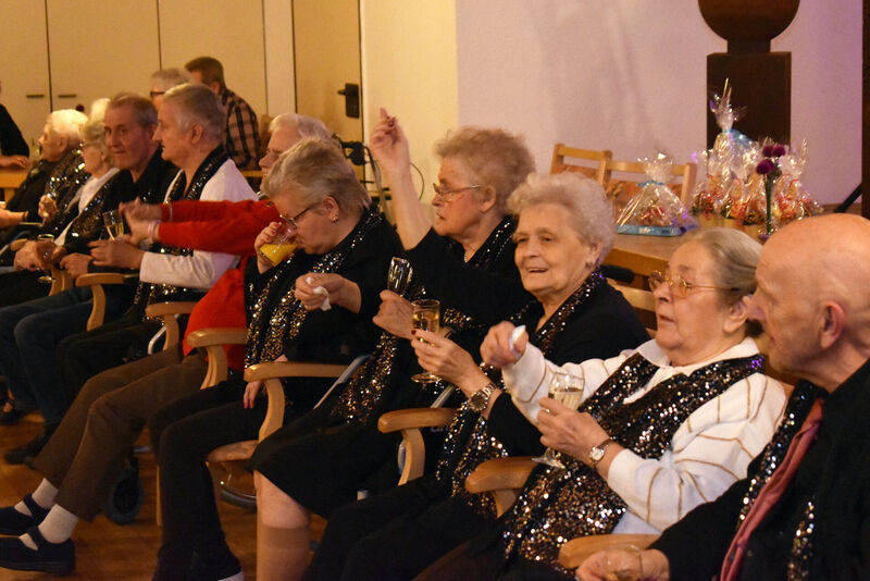Monatelang haben die Bewohnerinnen und Bewohner zusammen mit dem kompletten AWO-Team unter der Regie von Pia Doil geplant, geprobt und vorbereitet, um aus dem Fest ein gelungenes Erlebnis für alle zu machen. Schlag auf Schlag wechselten sich Bewohner und AWO-Mitarbeiterinnen und Mitarbeiter bei den verschiedenen Programmpunkten ab. Ob der Eröffnungstanz der Bewohner-Gruppe „Herzbeben“, der mexikanische „Säbeltanz“ und die Zumba-Show der Mitarbeiter - das Publikum war begeistert. Ein Höhepunkt des Programms war sicher die Polonaise, in die auch Rollstuhlfahrer integriert wurden. Mit Pailletten-Schals geschmückt brachten die flotten Damen und Herren den Saal gehörig in Schwung.