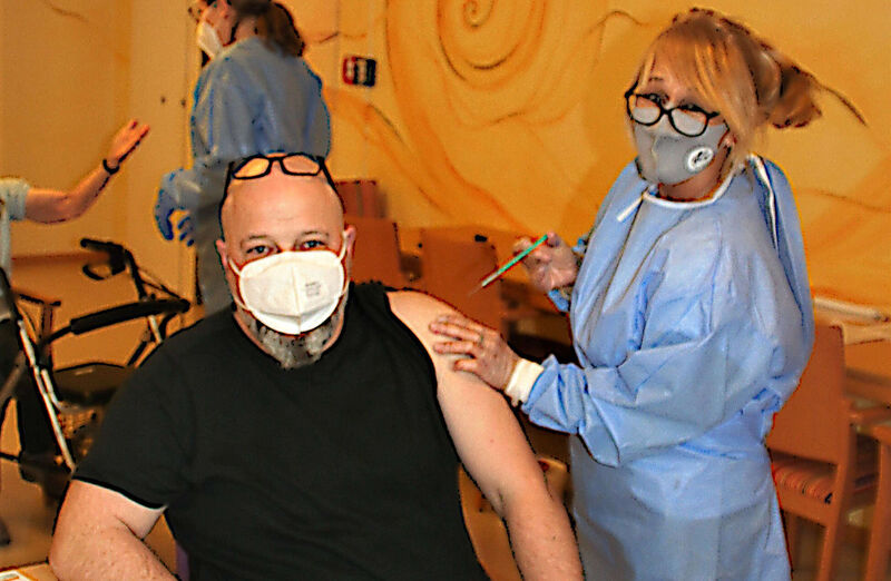 Planmäßig sollte es um 12.30 Uhr mit der 3. Etage losgehen, doch zur Freude aller, war schon um kurz vor 11 Uhr alles bereit, sodass wir über eine Stunde früher mit dem Erdgeschoss beginnen konnten. Die zu impfenden Bewohner wurden von den Kolleg*innen der Etage nacheinander in den Saal gebracht, die Einwilligung und der Anamnesebogen von den Ärzten gelesen und unterschrieben und mit einem kleinen Pieks war es dann auch schon erledigt. Mutig und mit gutem Beispiel voran schritten Einrichtungsleitung Andreas Möller und Pflegedienstleitung Andreas Sümnik, danach folgten der Reihe nach die Bewohner*innen und Mitarbeiter*innen des Hauses. Nach 15 Minuten im extra eingerichteten Ruheraum, verließen die Bewohner des Maries den Saal mit den Worten: „So schlimm war es ja gar nicht!