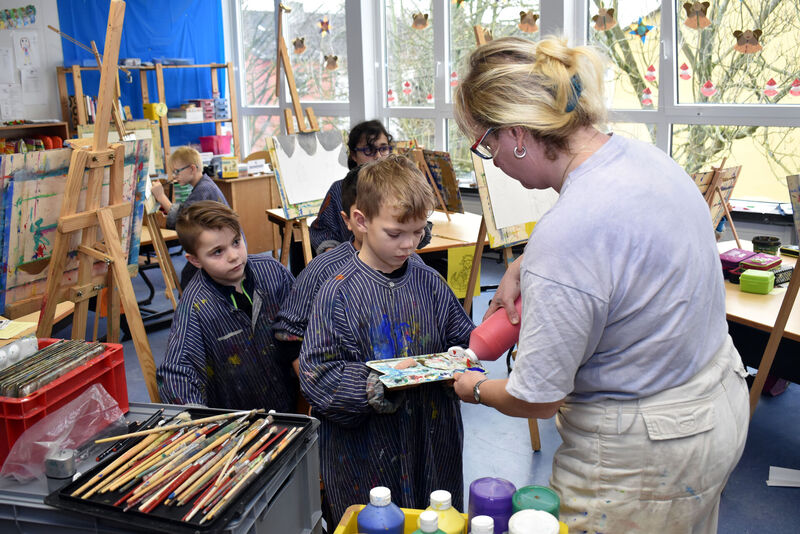 Das war das Einsatzgebiet der Künstlerin Susanne Nocke. Sie übernahm den Fall und half die Detektivinnen und Detektiven dabei, die Ergebnisse der Erkundungen in bunte Bilder zu verwandeln. Mit alten Bergmannshemden stilecht gegen Farbspritzer geschützt wurde emsig an den Staffeleien gearbeitet. Wie präsentiere ich meine Erinnerungen, welche Farben wähle ich und wie muss ich das Bild aufbauen – auf alle diese Fragen wusste die Essener Künstlerin, die gern mit Kindern arbeitet, eine Antwort.