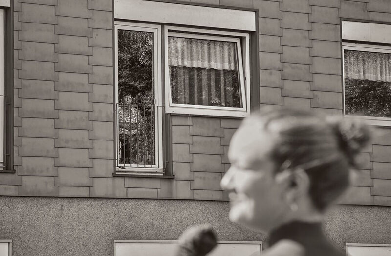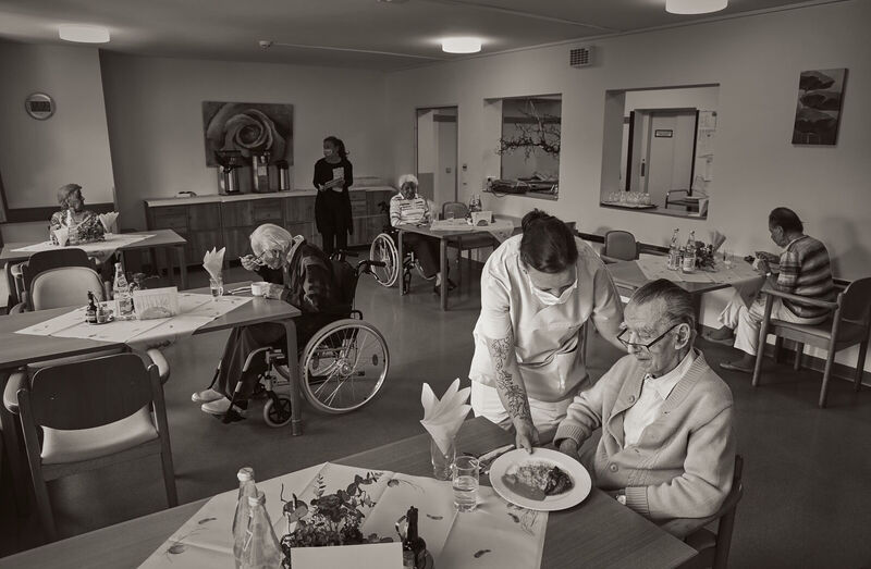 Die Bilderserie dokumentiert das soziale Leben während des ersten Lockdowns im Frühjahr 2020 und danach, zeigt auch u.a. eine Szene aus dem Speisesaal des AWO-Kurt-Schumacher-Zentrums in Überruhr. Aufgenommen wurde die Serie zwischen März und August 2020. Andreas Teichmann berichtet: „Im Jahr 2020 hat sich das Leben der Bevölkerung gravierend verändert. Mich interessierte,wie sich andere Menschen im Lockdown mit dieser neuen Lebenswirklichkeit verhalten und ob es sie verändert“,schildert er. Bleibt der Mensch ein soziales Wesen? Dieser Leitfrage ist er bei seiner folgenden Arbeit nachgegangen: „Diese Frage fotografisch zu untersuchen war organisatorisch aufwändig und ich benötigte viel Zeit, Vorgespräche und eine umfangreiche Schutzausrüstung, um mich und die Menschen, die ich aufsuchte, zu schützen. Erst waren es private Kontakte, die mir Zugang gewährten, dann bin ich über Kirchen, soziale Verbände, Schulen, Kitas, Altenheimen und Kliniken mit Menschen zusammengekommen, für die Social Distancing zu sehr unterschiedlichen ,neuen Normalitäten' geführt hat.“ Auch mit der AWO hatte er sich in Verbindung gesetzt und die Freigabe zur Fotografie erhalten. Andere Aufnahmen zeigen u.a. den Ruhrbischof Franz-Josef Overbeck beim Verlesen einer Messe via Livestream oder die Notbetreuung der evangelischen Kindertagesstätte "Vogelnest".