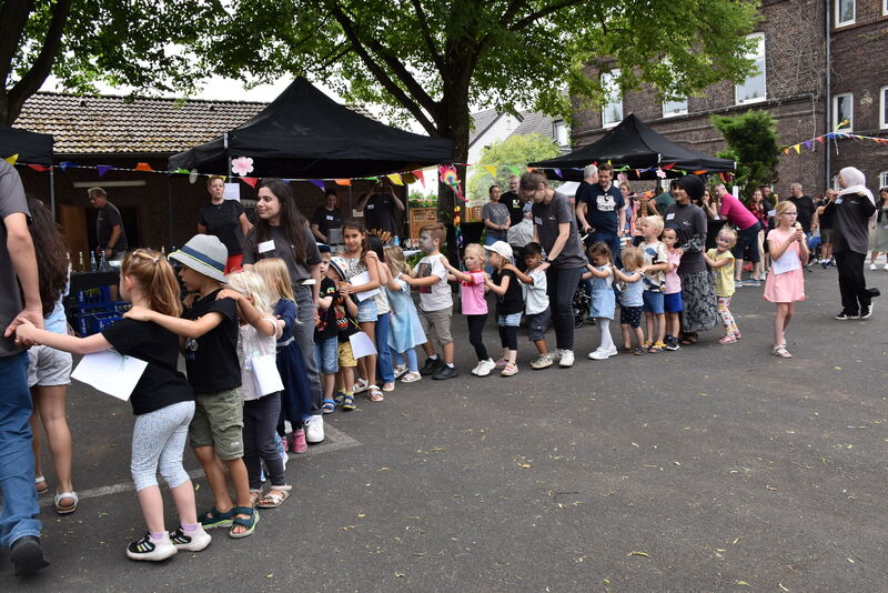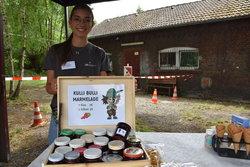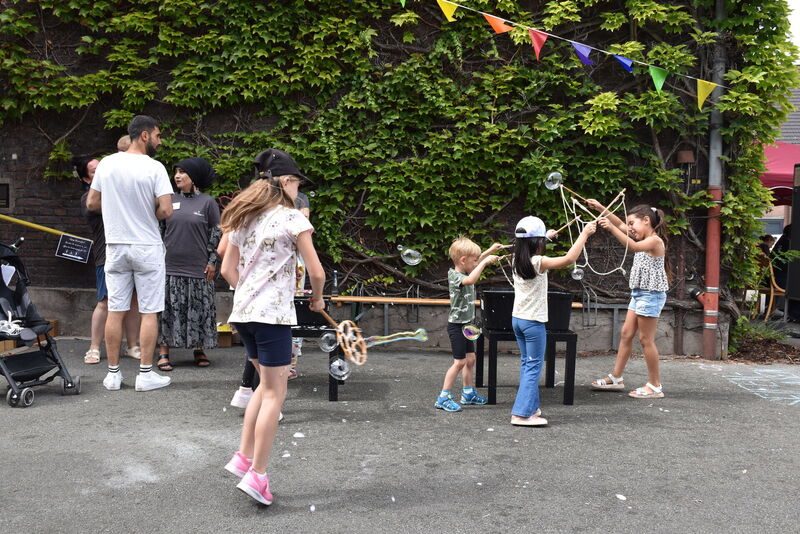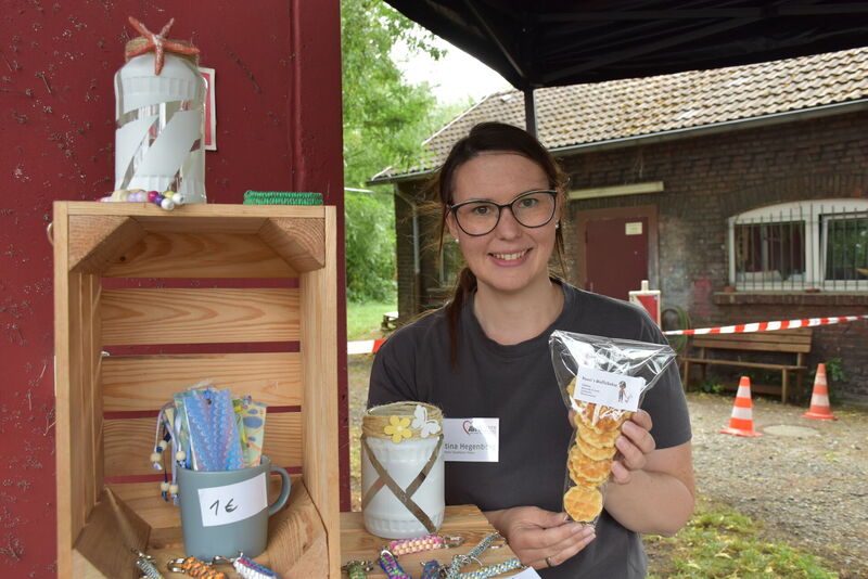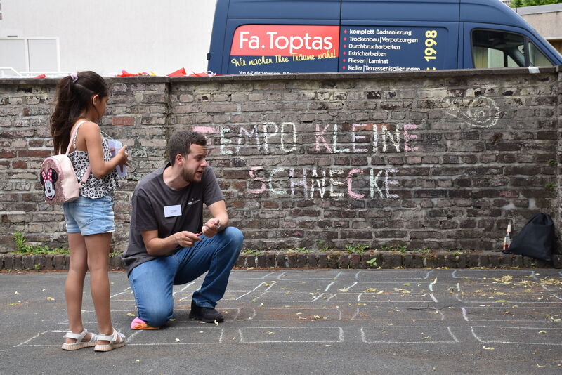 Klar, dass bei so einer Gelegenheit Attraktionen für die Kinder vom Seifenblasenstand über Aufklebe-Tätowierungen, Eierlaufen, „Tempo, kleine Schnecke“ oder Basteln Spiele noch und nöcher organisiert wurden. Auch für das leibliche Wohl von Waffel bis Bratwurst sorgten die Kolleg*innen und Ehrenamtlichen. An eigenen Ständen boten die beiden Häuser jeweils Selbstgebasteltes (Hans-Gipmann/u.a. Schlüsselanhänger) oder Hergestelltes (Kita/u.a. Johannisbeermarmelade) an.