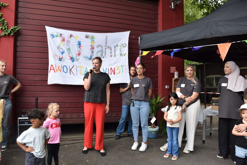 Darunter auch Claudia Osterholt, Vorständin der AWO Essen: „Einen herzlichen Glückwunsch zum Geburtstag und vielen Dank an die Eltern, die uns hier ihr Vertrauen schenken“, unterstrich sie bei der Begrüßung. Kristina Hegenberg stellte fest: „Unsere Teams arbeiten nicht nur hervorragend als ein Familienzentrum zusammen. Wir sind quasi ein Team der beiden Häuser.“ Für die Kita-Koleg*innen hatte sie noch eine besondere Überraschung parat, einen großen Geburtstagskuchen mitgebracht. Und auch die Kita-Kinder waren aktiv dabei: Nach putziger Polonaise quer über den Innenhof brachten sie „ihrer“ Kita noch ein Geburtstagsständchen.