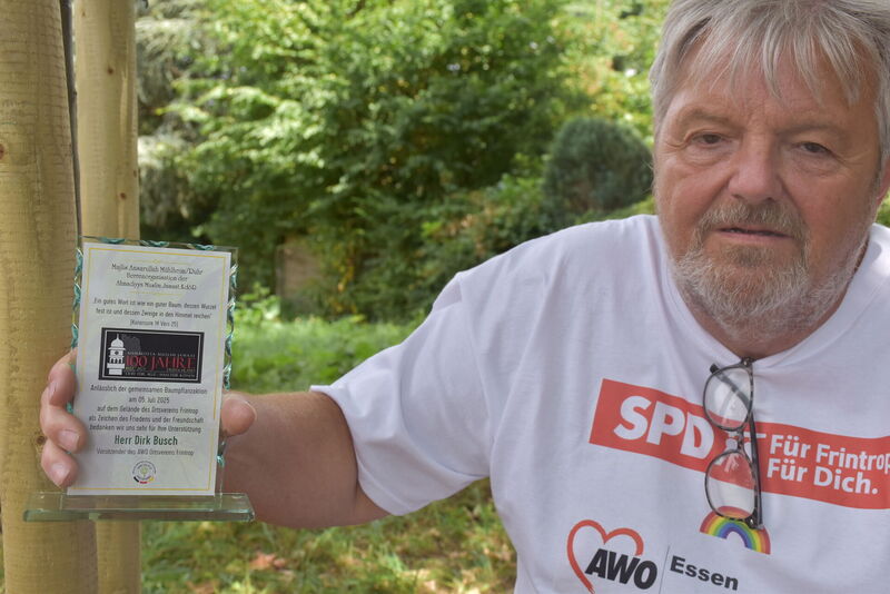 Doch bevor das Fest mit Hüpfburg, DJ, Senior*innengymnastik, Kinderspielen und -schminken und vielem mehr so richtig losging, wurde es feierlich. Seit Jahren sind der Ortsverein Frintrop und die Ahmadiyya-Gemeinde aus Mülheim eng befreundet und haben viele gemeinsame Aktionen gestartet. Als Zeichen des Friedens und der Freundschaft hatte die muslimische Gemeinschaft nun einen Apfelbaum dabei, der gemeinsam eingepflanzt wurde und dauerhaft auf dem Gelände die Beziehung zwischen den Freund*innen symbolisiert. Als weiteres Zeichen von Gastfreundschaft hatte die Gemeinschaft aus Mülheim zusätzlich ein Reisgericht mitgebracht, das kostenlos verteilt wurde.