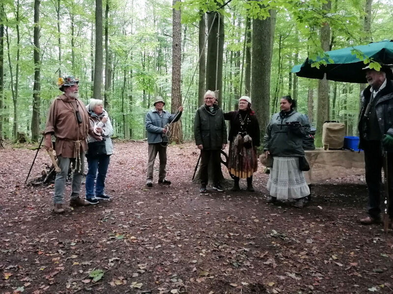 Am nächsten Tag war Bad Orb das Ziel. Nach einem herbstlichen Rundgang, wo einige bis hinauf zur Saline, den Salinenbrunnen davor und dem schönen Kurpark gingen, zog sich einige in die Cafés zurück. Dann fuhr der Reisebus in den tiefen Wald des Spessarts. Dort, zu aller Überraschung, wurden die Gruppe von den „Spessarträubern überfallen“ und ihnen die Uhren abgenommen. Das war ein Erlebnis, welches keiner so schnell vergessen wird. Franz und Karin bekamen ein Joch um den Hals und wurden symbolisch am Strang aufgehangen. Sie hatten angeblich zu viel gesündigt ... Auf den Schreck und zum Aufwärmen gab es Kräuterschnaps, Äppelwoi und zünfitge Lieder.