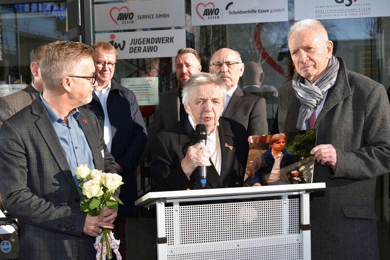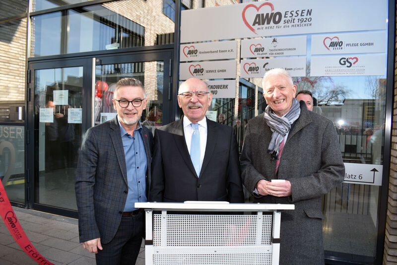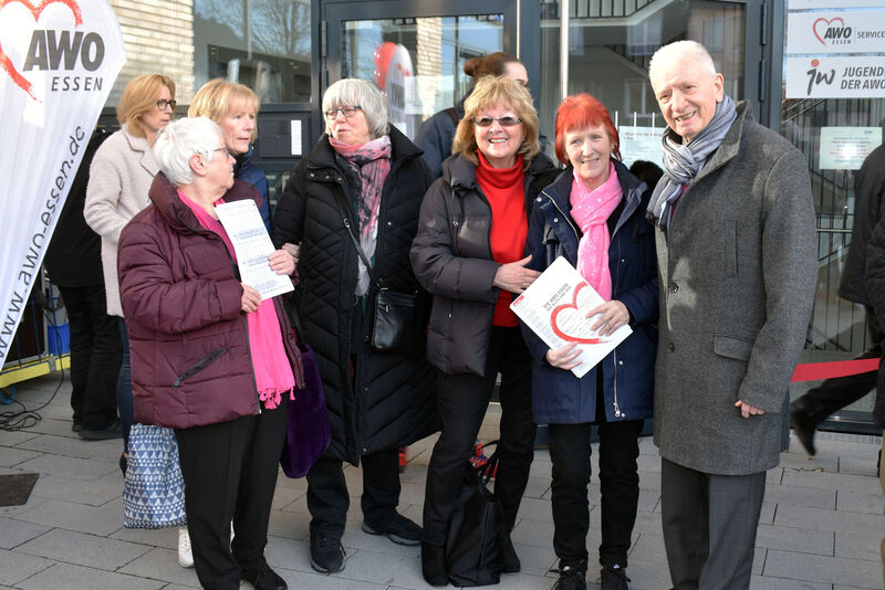Nachbarn, Freunde, Mitglieder und Mitarbeiter waren eingeladen, sich die neue Geschäftsstelle und die neue Kita präsentieren zu lassen. Das Wetter spielte bei der Eröffnung des Besichtigungstages mit, so konnte der kleine Festakt kurzerhand vor die Tür auf den Holsterhauser Platz verlegt. werden. Für die Stadt erinnerte der 1. Bürgermeister Rudi Jelinek an die wichtige Rolle, die die AWO mit ihren fast 6000 Mitgliedern und rund 1500 Mitarbeitern ihren Kitas, Bürgerhäusern und Senioreneinrichtungen in Essen spielt. Der AWO Kreisvorsitzende Klaus Johannknecht gab bei der von AWO Geschäftsführer Oliver Kern moderierten Eröffnung einen Ausblick auf die Feiern zum 100. Geburtstag der Essener AWO in diesem Jahr. Auch das Jugendwerk der AWO war bei der Eröffnung vertreten. Die Vorsitzenden Cathrin Zimmermann und Alex Kriwopusk warben für die vielfältigen Jugend-Angebote. Und schließlich überreichte Hildegard Gottlob, nach deren Sohn das Georg-Gottlob-Haus der AWO in Überruhr benannt ist, eine Spende in Höhe von 5000 Euro für die Betreuung der dort lebenden an MS erkrankten Menschen.