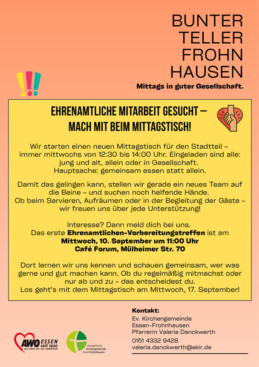 In Frohnhausen startet ein neues Nachbarschaftsprojekt: Der „Bunte Teller Frohnhausen“ der Evangelischen Kirchengemeinde Essen-Frohnhausen und der AWO Essen lädt ab Mitte September alle Menschen, die gerne in Gesellschaft essen oder sich über ein warmes Mittagessen freuen, zum wöchentlichen Mittagstisch. Unter dem Motto „Gemeinsam essen statt allein“ gibt es eine leckere Mahlzeit zum Preis von 3 Euro.