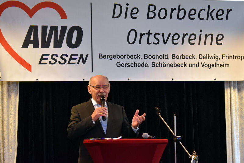 Welche Rolle die Arbeiterwohlfahrt in Essen spielte und noch immer spielt, daran erinnerte auch der erste Bürgermeister Rudi Jelinek in seinem Grußwort für die StadtEssen: „Im sozialen Bereich ist die AWO eine der stärksten Säulen in unserer Stadt!“ Wie schon Klaus Johannknecht bedankte er sich bei allen Männern und Frauen, die sich ehrenamtlich engagieren und so das soziale Leben in der Gesellschaft erst ermöglichen: „Das ist gelebte Solidarität!“