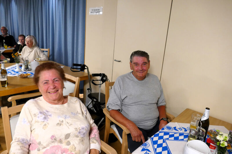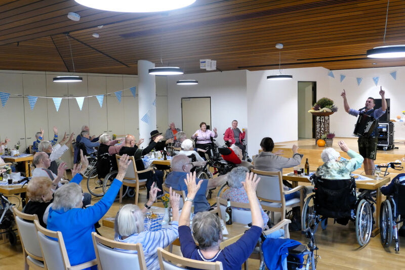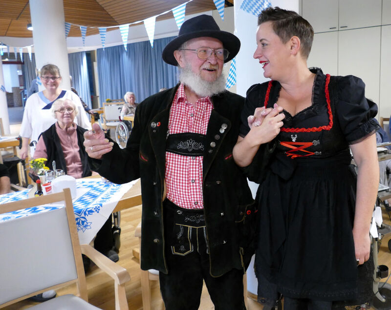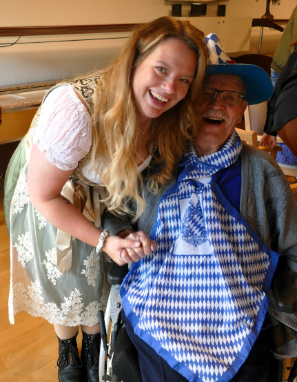 Der Saal des AWO Seniorenzentrums wurde zum Festzelt, die Mitarbeiter*innen des Sozialdienstes und der Pforte tauschten ihre Alltagskleidung gegen Dirndl und auch der ein oder andere Bewohner trug Tracht – im „Friedrich“ war wieder Oktoberfest. Und bei Bier, Wein, Cola und Fanta entstand eine gesellige „Wiesn“-Stimmung. Auf Wunsch der Bewohner*innen spielte DJ Dennis Bongardtz wieder auf. Und er schaffte es, sogar hartgesottene "Nicht- Schunkler" zur Bewegung zu animierte. Auch viele Angehörige fühlten sich wohl und beim gemeinsamen Abendessen, natürlich einem halben Hahn wie auf der Wiese, wurde noch viel gelacht und erzählt.