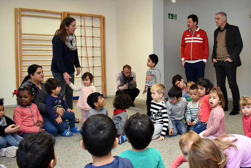 Der RWE-Traditions-Keeper Frank Kurth, der erstmals die AWO Kita besuchte, fand sofort einen guten Draht zu den kleinen Jungen und Mädchen: „Kinder sind unsere Zukunft und wir müssen dafür sorgen, dass alle gute Chancen haben. Für solches soziales Engagement bin ich immer zu haben.“