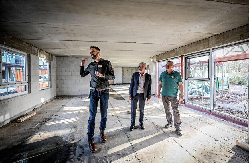 Die Senior*innen zeigen viel Geduld mit dem Umbau ihrer Wohnstätte. Alle müssen mindestens ein Mal während der Bauphase innerhalb des Hauses umziehen, denn das Prinzip ist, dass immer diejenigen in den als letztes sanierten Gebäudeteil ziehen, deren Domizile als nächstes umgebaut werden. „Wir wollten den Menschen einfach nur jeweils einen Umzug zumuten, die allermeisten möchten dann auch in ihren Zimmern bleiben, wenn sie schon einmal umgezogen sind“, sagt Colin Becker. Die älteren Damen und Herren werden jedoch nicht nur „aufgescheucht“, sie müssen auch mitunter Lärm und Dreck ertragen. AWO Geschäftsführer Oliver Kern: „Als AWO können wir uns nur für die Störungen entschuldigen und die tolle Kooperation bei unseren Bewohnerinnen und Bewohnern sowie deren Angehörigen bedanken. Das tun wir auch bei unserem Team, denn nur durch deren Geduld und Flexibilität ist ein Umbau im laufenden Betrieb überhaupt zu meistern.“