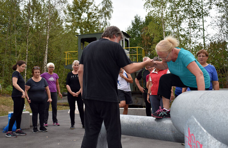 Den Kern der gut gelaunten Trainingstruppe stellten die Mitglieder der Ü50-Freizeitgruppe des AWO-Ortsvereins Katernberg. Dazu kamen noch ältere Nachwuchs-Traceure, die durch Radio und Zeitung auf das Ereignis aufmerksam geworden waren. Auch wenn nicht alle jede Übung mitmachen konnten, war man doch angenehm überrascht, wie viel Spaß das gemeinsame Training machte. „Gesehen habe ich schon oft, was die jungen Leute hier machen. Aber selbst einmal erste kleine Sprünge auf dem Gelände zu absolvieren, das ist schon ein tolles Erlebnis. Gerade unsere Gruppe möchte immer gern neue Erfahrungen sammeln“, fasst Marianne Klesper ihre Eindrücke zusammen. Sie leitet die Katernberger Ü50-Gruppe der AWO, die sich sonst zu Wanderungen, Theaterbesuchen oder Kurzreisen trifft.