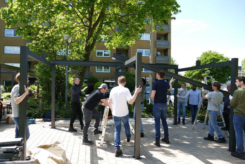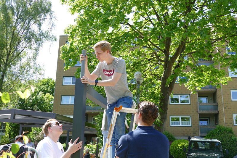 Über eine neue Fahrradgarage, neudeutsch auch Bikeport – schließlich gibt es keine Seitenwände – freut sich das Team des Kurt-Schumacher-Zentrums der AWO am Überruhrer Rüpingsweg. Elf Mitarbeitende der thyssenkrupp Management Consultung spendeten ihren Social Day der Senioreneinrichtung und haben ordentlich vor dem Haus angepackt. In rund sieben Stunden hatten sie aus einem Bausatz für ein Alu-Carport das neue Bikeport zusammengesetzt. Dies wurde allerdings noch einmal bei Seite gestellt, damit der Platz drumherum noch hergerichtet werden kann. Spätestens zum Sommerfest am 6. Juli sollen sowohl Abstellplätze für Besucher*innen, als auch Ladestationen für E-Bikes entstehen.