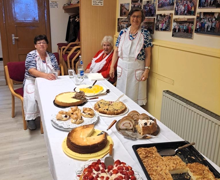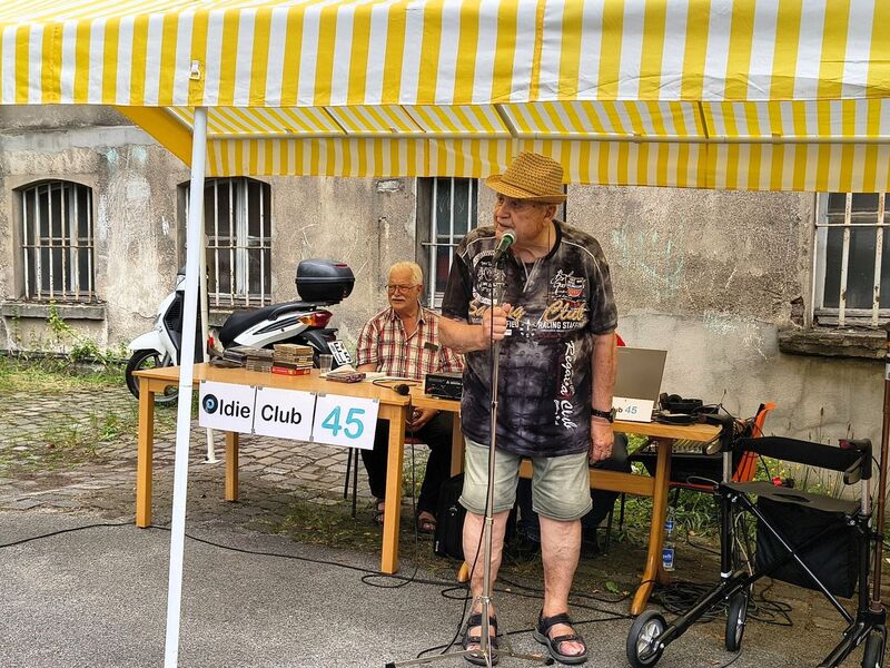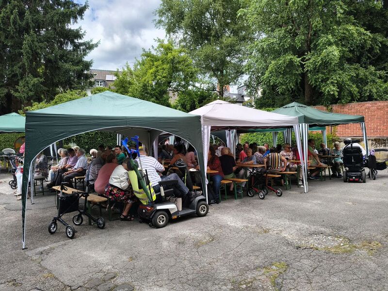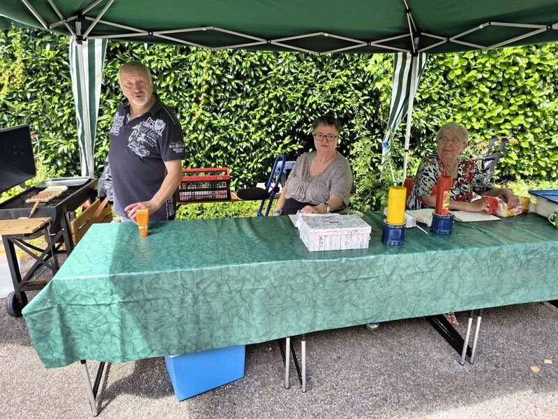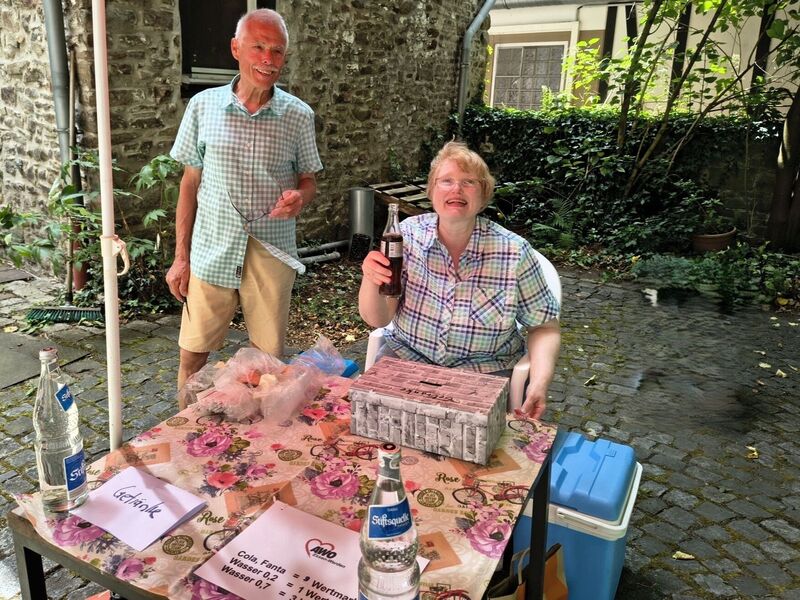 „Schon morgens trafen sich viele ehrenamtliche Helfer*innen, um Tische, Bänke, Pavillons, Getränke und was noch alles für eine gelungenes Sommerfest nötig ist, aus den Kellerräumlichkeiten des AWO Treffs Werden raus in den Innenhof zu tragen. Da viele der HelferInnen bereits Einschränkungen haben, unterstützen auch Benny Brenk, Daniel Henschke, Philipp Hennen und Clemens Andres den Auf- und Abbau. Nach getaner Arbeit konnten sich alle bei Kaffee und belegte Brötchen stärken. Das eigentliche Fest begann um 14 Uhr bei schönstem Wetter. Für Schatten war mit den Pavillons gesorgt und Jürgen Lukas (1. Vorsitzender) begrüßte die Gäste und bedankte sich bei allen. Für Stimmung und Tanz sorgten Werner am Keyboard und der OldieClub 45 (Peter und Peter, die auch regelmäßig eine Sendung in Radio Essen haben) Würstchen wurden gegrillt, Faßbier gereicht und auch das reichhaltige Buffet mit selbstgebackenen und gespendeten Kuchen durfte nicht fehlen. Hannes und Rumpeline (Ulrike Bilda) luden zum Glücksradspiel, Kinderschminken und Diabolo spielen ein und Rumpeline sorgten für strahlende Augen mit selbstgeknotete kostenlosen Luftballontieren.
