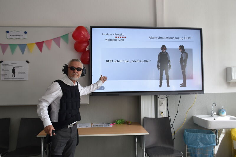 „Hallo… Haalloo!“ Auch beim zweiten Ansprechen stapft der Mensch im Alters-Simulationsanzug einfach weiter. Kein Wunder, trägt er nicht nur eine dicke Brille zwecks Simulierung eines grauen Stars, eine schwere Weste um den Oberkörper und steife Kniebandagen, sondern auch Kopfhörer. Die sollen die Schwerhörigkeit simulieren – und das tuen sie auch. „Ich habe kaum etwas gehört, das war schon eine krasse Erfahrung“, berichtet AWO Vorstand Oliver Kern, nachdem er alle „Accessoires“ des Simulationsanzugs abgelegt hat. Ganz schön viel zu gucken und zu tun hatten er, AWO Vorständin Claudia Osterholt und AWO Vorstandsreferent Philipp Hennen beim Tag der offenen Tür des Bildungsinstitutes Pflege der AWO an der Peterstraße 2 im Nordviertel.