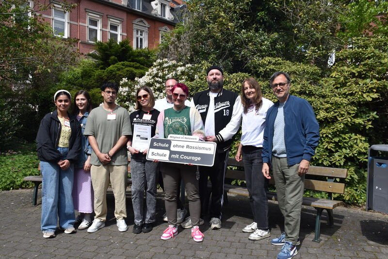 Zudem stand noch ein ganz besonderes Highlight an. Die Pflegeschule trägt nun das Siegel „Schule ohne Rassismus. Schule mit Courage“. Tanju Dilekli vom Kommunalen Integrationszentrum übergab feierlich die dazugehörige Urkunde und das neue Schild, das zeitnah am Gebäude angebracht wird. Nun heißt es für die Schule, den Titel mit Leben zu füllen. Florian Friedrichs, pädagogischer Mitarbeiter der Schule, hat die Bewerbung um den Titel initiiert und begleitet. Er erläutert: „Heute starten wir mit einem gemeinsamen Spaziergang zu zwei geschichtsträchtigen Orten. Der Gerlingsplatz war Schauplatz der Bücherverbrennung, die heutige Kneipe „Panoptikum“ bis 1933 ein Treffpunkt für Homosexuelle. Außerdem war das Hedwig-Levy-Haus selbst früher ein jüdisches Kinderheim.“ Unterstützung bekommt die „neue“ „Schule ohne Rassismus. Schule mit Courage“ von Thorsten Teriete, Inhaber des „Panoptikum“, ihn konnte die Lehranstalt als Paten gewinnen. Auch dazu sagt die AWO: Danke!