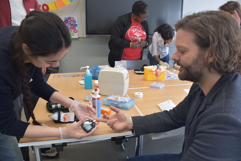 Denn die Einrichtung, die für die AWO und andere Träger u.a. die schulischen Teile der Ausbildungen zu Pflegefachkraft und -asstistenz, Betreuungsassistenz und einiges mehr anbietet, bot an diesem Tag viel Wissenswertes und eine Menge Unterhaltung. In insgesamt acht Räumen konnten sich die Gäste Einträge für ihre Stempelkarte holen, in jedem gab es etwas zu sehen und/oder zu tun: Blutdruck messen, Blutzucker bestimmen, den hauseigenen Simulationsanzug ausprobieren oder an lebensgroßen Puppen Erste Hilfe üben waren nur einige der Angebote, die das Team des Bildungsinstitutes und um die 60 Schüler*innen vorbereitet hatten. Schulleiterin Ulrike Münckel: „Am Ende wartete dann eine süße Überraschung auf unsere Gäste. Wir danken dem tollen Einsatz unserer Schülerinnen und Schüler und der Lehrkräfte heute.“