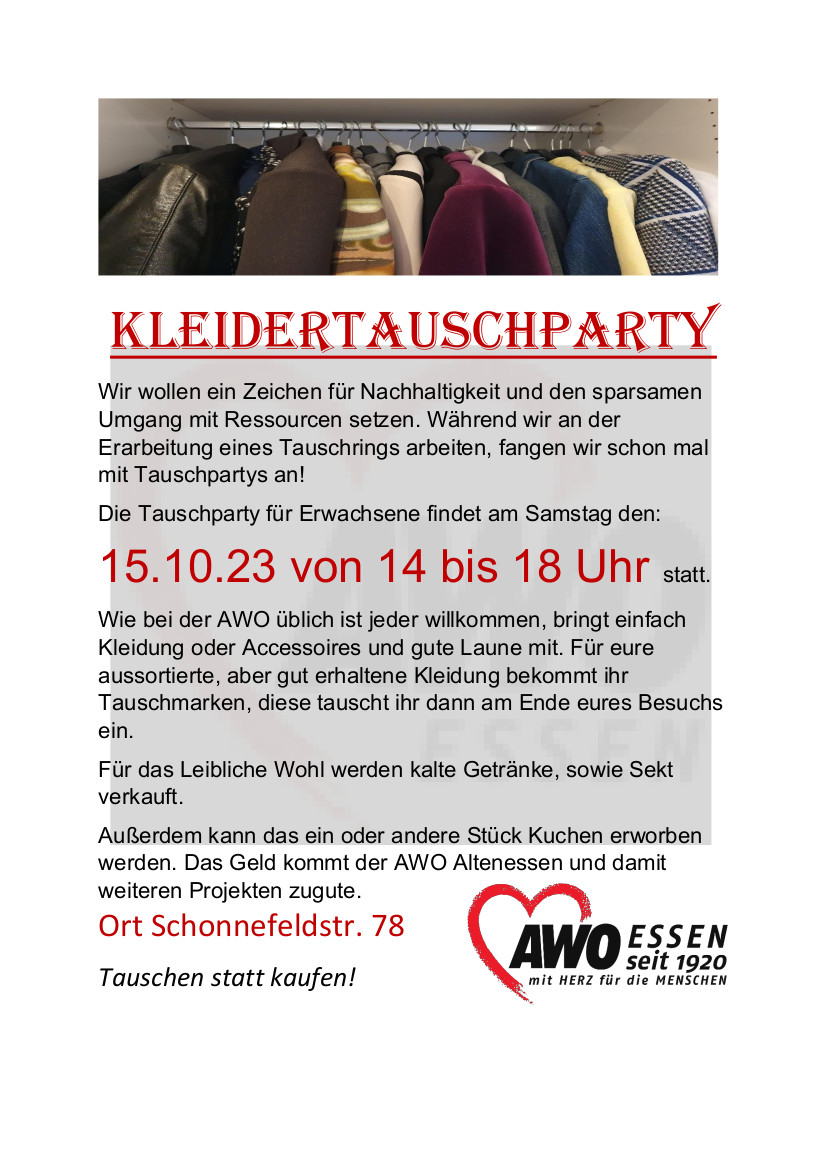 Der AWO Ortsverein Altenessen möchte gerne im Stadtteil einen Tauschring aufbauen. Nun laden die Altenessener*innen zum Generationencafé und zur Kleidertauschparty. Los geht’s am Sonntag, 15. Oktober, um 14 Uhr in den Clubräumen an der Schonnefeldstraße 78. Jeder Besucher und jede Besucherin sind willkommen. Wer tauschen möchte, der bringt einfach abgelegte Kleidung, Handtaschen oder Accessoires mit. Die Kleindung sollte allerdings in ordentlichem Zustand sein. Für jedes eingetauschte Stück kann man sich ein anderes mit nach Hause nehmen. Für Kaffeetafel und leibliches Wohl wird gesorgt.