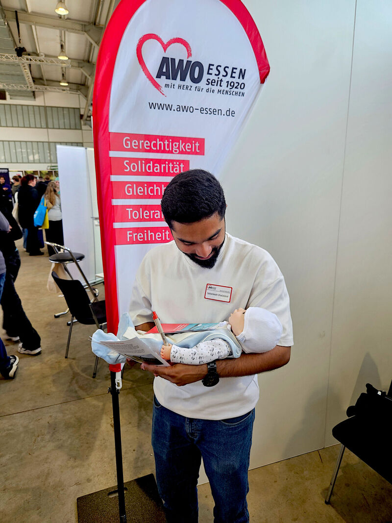 „Wir freuen uns sehr, dass wir bei der Ausbildungsmesse auf so viel Interesse und Zuspruch gestoßen sind“, berichtet Joana Meißner, stellvertretende Leiterin der Personalabteilung bei der Essener AWO und Organisatorin des Messeauftrittes der AWO auf dem Weltkulturerbe. Auch für Unterhaltung hatte sie zusammen mit den Mitstreiter*innen der verschiedenen AWO Bereiche gesorgt. Das BAA hatte einen Altersanzug mitgebracht, in dem jede und jeder die oder der wollte einmal testen konnte, wie es sich anfühlt, im Alter nicht nur sehr viel schlechter zu sehen und dabei maßgeblich in der Bewegung eingeschränkt zu sein. Der Bereich Kita hatte ein „Pflegekind“ dabei – eine Puppe, an der wichtige Handgriffe bei der Betreuung der kleinsten Kita-Besucher*innen demonstriert werden konnten.