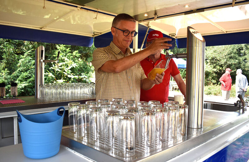 Als einer der ersten begrüßte ihn AWO-Geschäftsführer Oliver Kern, der gleich in dreifacher Funktion auf dem Fest, das im Laufe den Nachmittages rund 1500 Kindern Spaß bereitete, unterwegs war. Als Mitglied des AWO Ortsvereins Überruhr, als Vorsitzender des Vereins Bürgertreff Überruhr und schließlich als stellvertretender Vorsitzender des Überruhrer SPD-Ortsvereins war er überall zu finden, wo eine helfende Hand benötigt wurde. Sein Stammplatz war schließlich an der Getränketheke, wo er am Zapfhahn als Durstlöscher aktiv war.