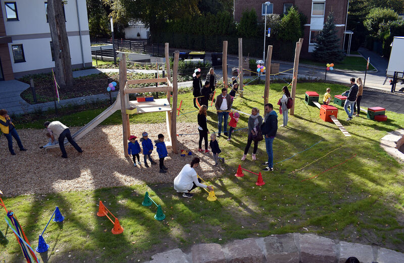 Leichtfüßig nehmen die kleinen Jungen und Mädchen die Hindernisse, die auf dem sattgrünen Rasen aufgebaut wurden. Dass in der AWO Kita Einigkeitstraße Bewegung ein Schwerpunktthema ist, wird bei der offiziellen Einweihungsfeier für die neueste Kindertagesstätte der Essener Arbeiterwohlfahrt deutlich. Ob in den freundlichen Innenräumen oder auf dem geschickt modellierten Flächen des Außengeländes, überall werden die Kinder eingeladen, sich zu bewegen.