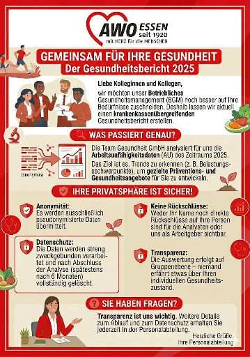 Gemeinsam für unsere Gesundheit! In den nächsten Wochen werden wir mit der Team Gesundheit Gesellschaft für Gesundheitsmanagement mbH einen kassenübergreifenden Gesundheitsbericht für das Jahr 2025 erstellen lassen. Ziel ist es, mit den Ergebnissen Maßnahmen im Rahmen unseres Betrieblichen Gesundheitsmanagements zu optimieren und neue Maßnahmen zu entwickeln. Bei Fragen zum Bericht könnt ihr gerne uns oder die Kolleg*innen aus der Personalabteilung ansprechen!