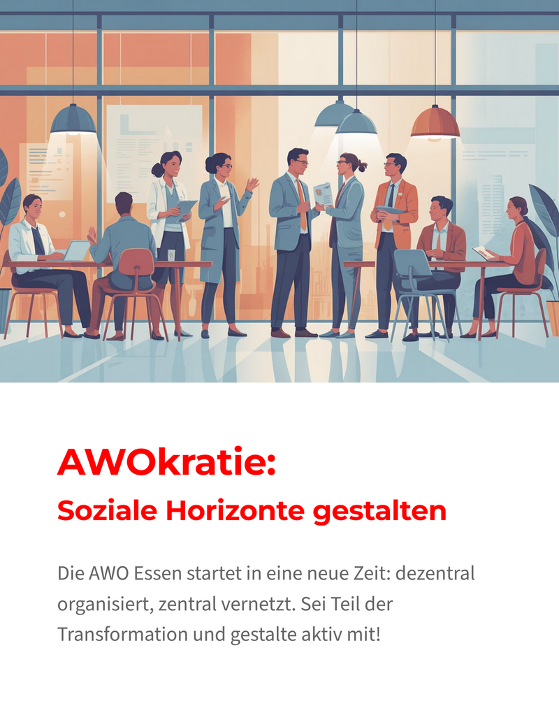 Die AWO Essen bricht auf in eine neue Zeit: dezentral organisiert, zentral vernetzt und sozial engagiert. Mach mit, wenn wir Strukturen neu denken, Zusammenarbeit lebendig gestalten und soziale Horizonte erweitern. Sei Teil der Transformation – gestalte mit uns die Zukunft der AWO! Wer mehr Informationen möchte, findet diese unter Laufwerk N:\AWO Essen Infos\Vorstand\AWOkratie oder bei der jeweiligen Führungskraft.