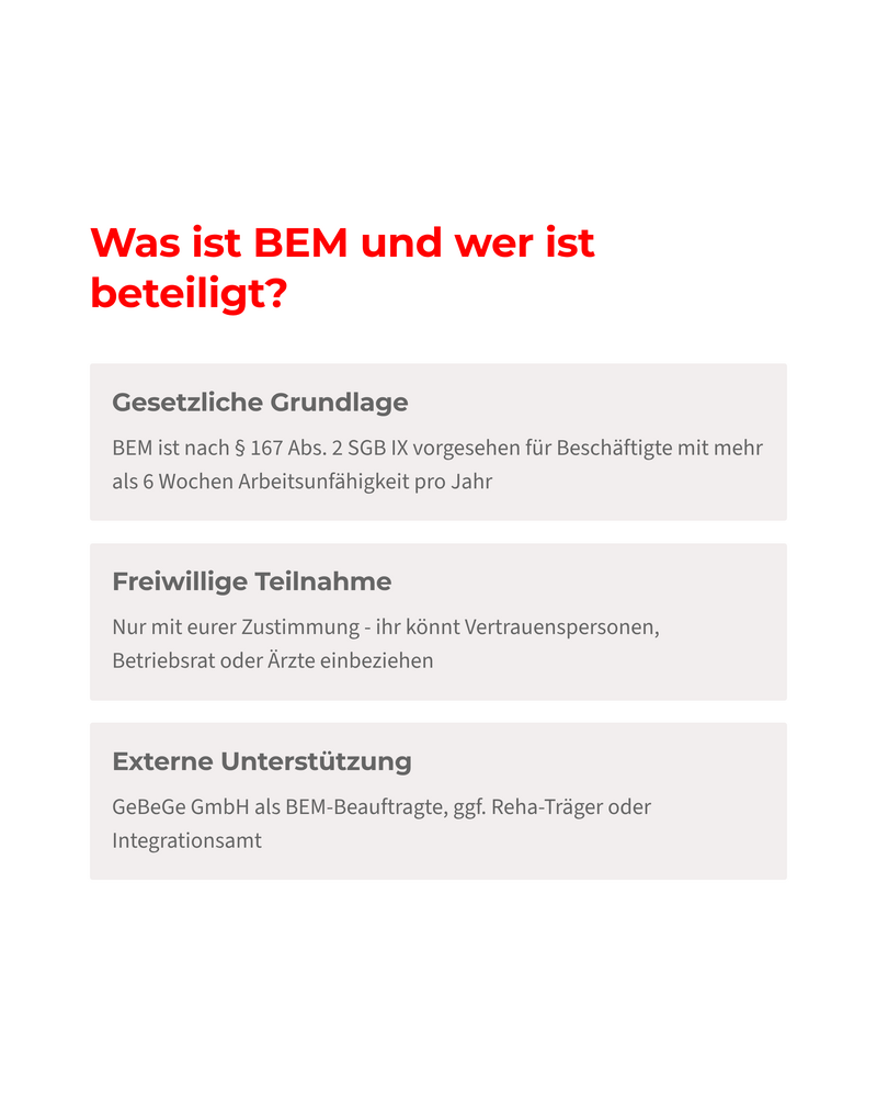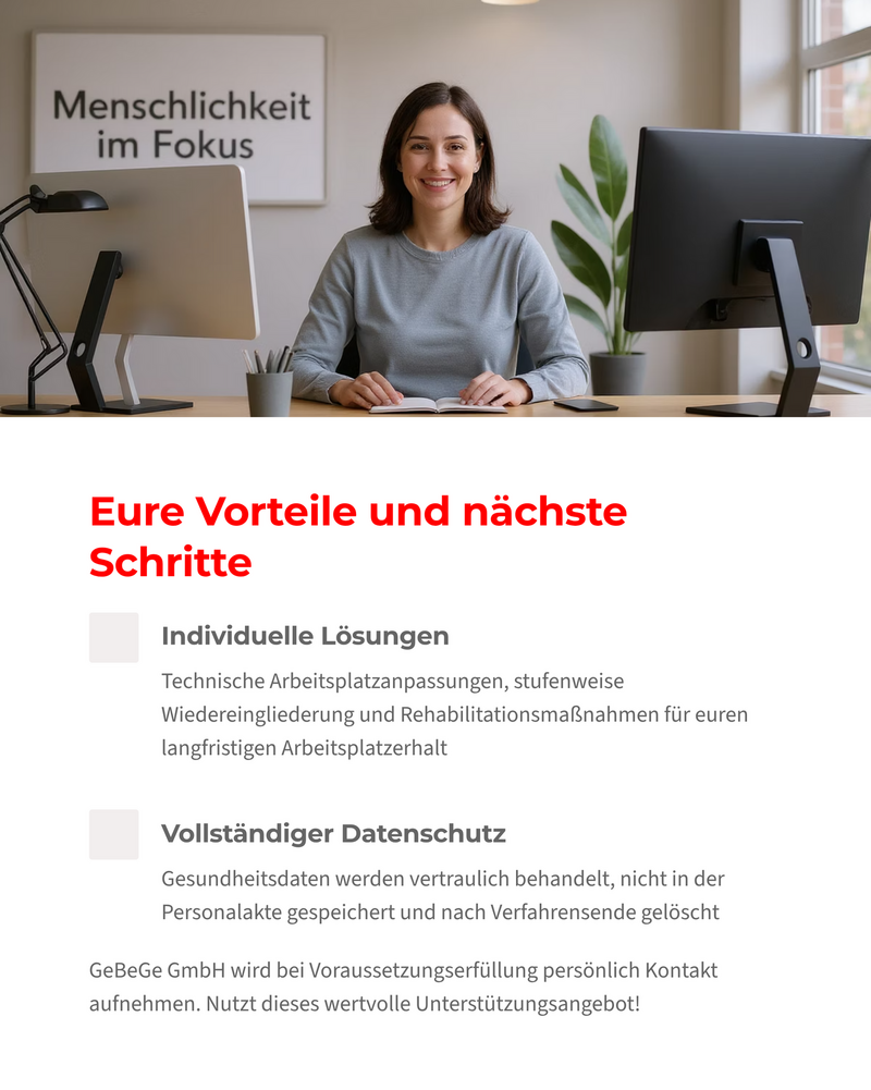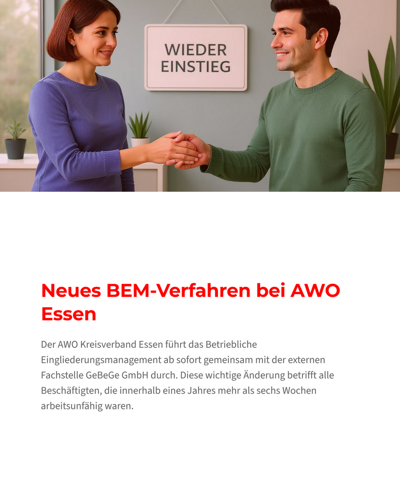 Neues BEM-Verfahren: Eure Gesundheit, unsere Unterstützung! Ab sofort begleiten wir Euch mit der GeBeGe GmbH – freiwillig, vertraulich und maßgeschneidert für alle, die länger als 6 Wochen krank waren.